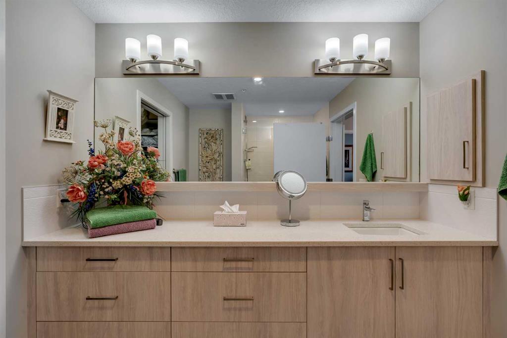 **ADULT LIVING** Welcome to resort-style living in Westman Village, located in Calgary’s sought-after lakeside community of Mahogany. This pristine, nearly 1,000 sq. ft. 2-bedroom, 2-bathroom condo in the exclusive 55+ building offers a bright, open-concept layout with full wheelchair accessibility, including wide hallways and mobility-friendly bathrooms. The modern kitchen features quartz countertops, multiple deep drawers, an appliance garage, high-end stainless steel appliances, and an eat-up island, flowing seamlessly into the living and dining areas. The spacious primary bedroom includes a walk-in closet and a 3-piece ensuite, while the second bedroom—complete with a Murphy bed—is ideal for guests, a TV room, or a home office. Elegantly appointed with custom light fixtures and draperies, this immaculate home is waiting for you. Additional highlights include air conditioning, a large laundry room, ample in-unit storage, titled secure, underground parking (additional stalls are available for purchase), and a storage locker. Enjoy the beautiful sunrise and views of Mahogany Lake. A perfect place to “people watch” as they walk along the pathways, enjoying nature. The large balcony provides plenty of private outdoor living space. The orientation of this unit means you aren’t baking in the sun, but still enjoy an abundance of natural light. You can access the Westman Village Centre without going outside (this home is on the same floor as the +15 walkway to the amenities building), where you can purchase pre-made dinners if you don’t want to cook, your morning coffee, and other snacks, while enjoying the vast amenities that come with living here. Residents have access to the 40,000 sq. ft. Village Centre via +15, offering an indoor pool, fitness centre, walking track, theatre, golf simulator, and more. Concierge service and 24/7 security provide added peace of mind. You are only steps to Mahogany Lake, Beach Club, walking paths along the Lake, shops, and nearby amenities. There is no other complex in the city that compares to Westman Village! MLS®: A2300482 - Mahogany Apartment-Single Level Unit $675,000