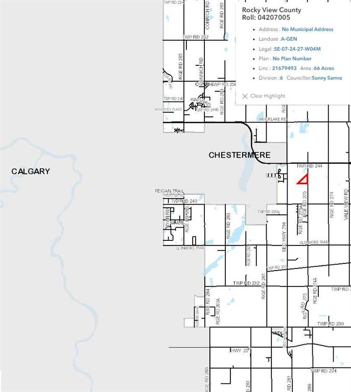 Includes: N/A Site Influences: Cleared, Farm, Views Property InformationProperty Type: Commercial Land Brokerage: RE/MAX First Listed Date: Please login or create an account Community InformationCity/Town: Rural Rocky View County Community: Rural Rocky View County ExteriorLot Size: 66.00 sq.ft. Lot Shape: Cleared,Farm,Views Frontage: 722 InteriorRoomsTotal Bedrooms: 0 (Bedrooms Above: 0) Bathrooms: Full: 0 / Half: 0 Above Grade: 0 Legal, Financial & PossessionZoning: A-GEN Tax: 129.08 Possession: 30 Days / Neg,Negotiable Listing Courtesy of RE/MAX First The data included in this display is deemed to be reliable, but is not guaranteed to be accurate by the Calgary Real Estate Board. MLS®: A2285639 - Rural Rocky View County $2,442,000